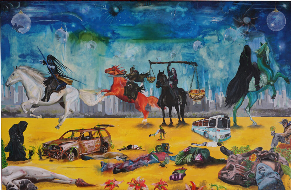 Beim Öffnen der ersten vier Siegel erscheinen nach Schilderung aus der Apokalypse die vier apokalyptischen Reiter.